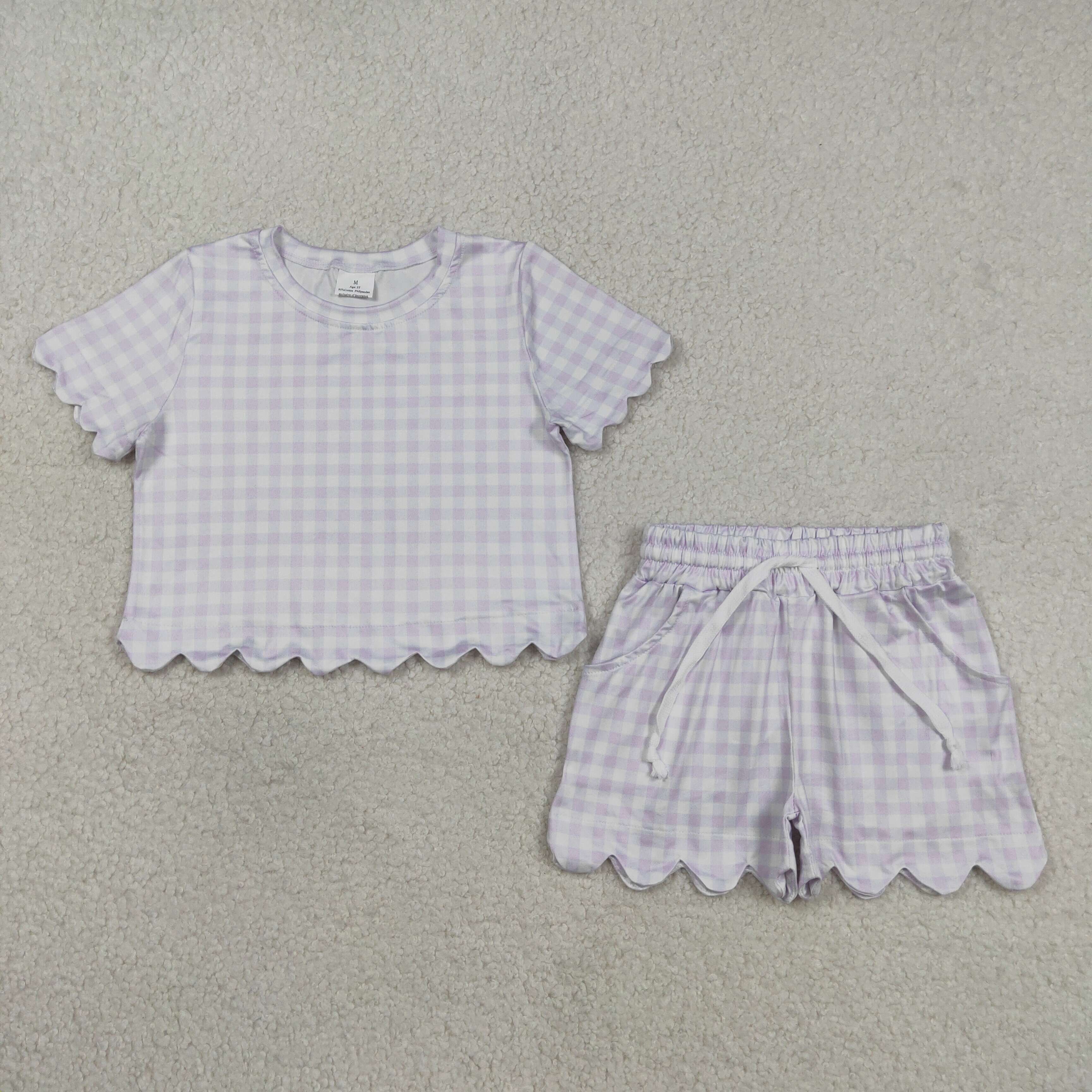 GSSO3181 RTS kids clothes purple gingham print girl summer clothing set summer shorts set