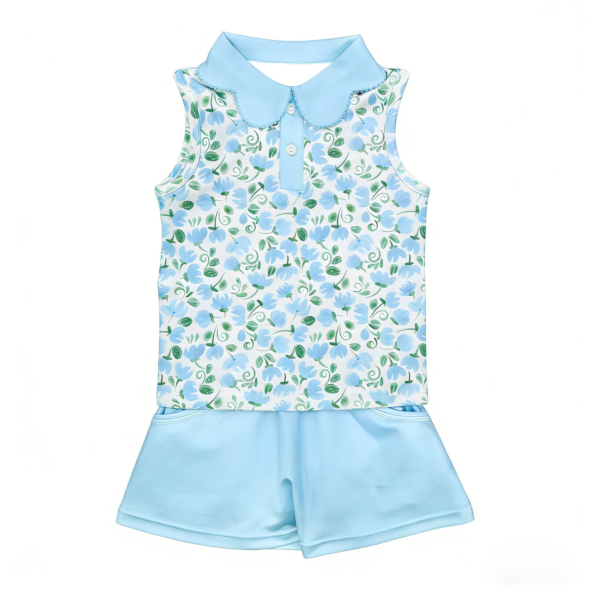MOQ:5pcs GSD3376 pre-order toddler girl clothes blue print girl yoga summer skirt set-2025.12.3