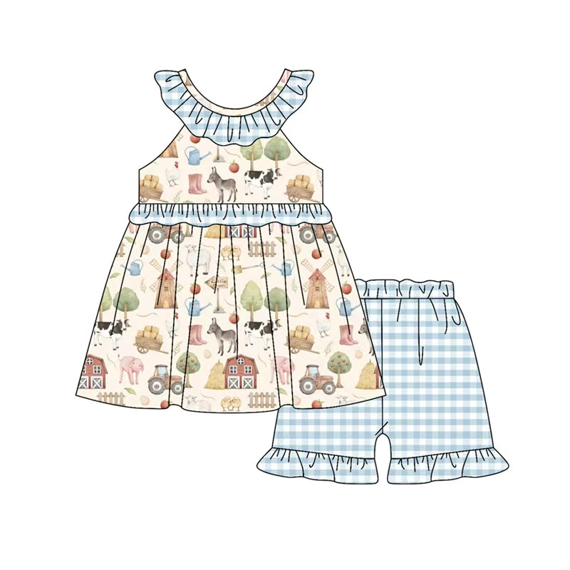 MOQ:5pcs GSD3933 pre-order toddler clothes blue print girl summer short skirt set-2026.3.16