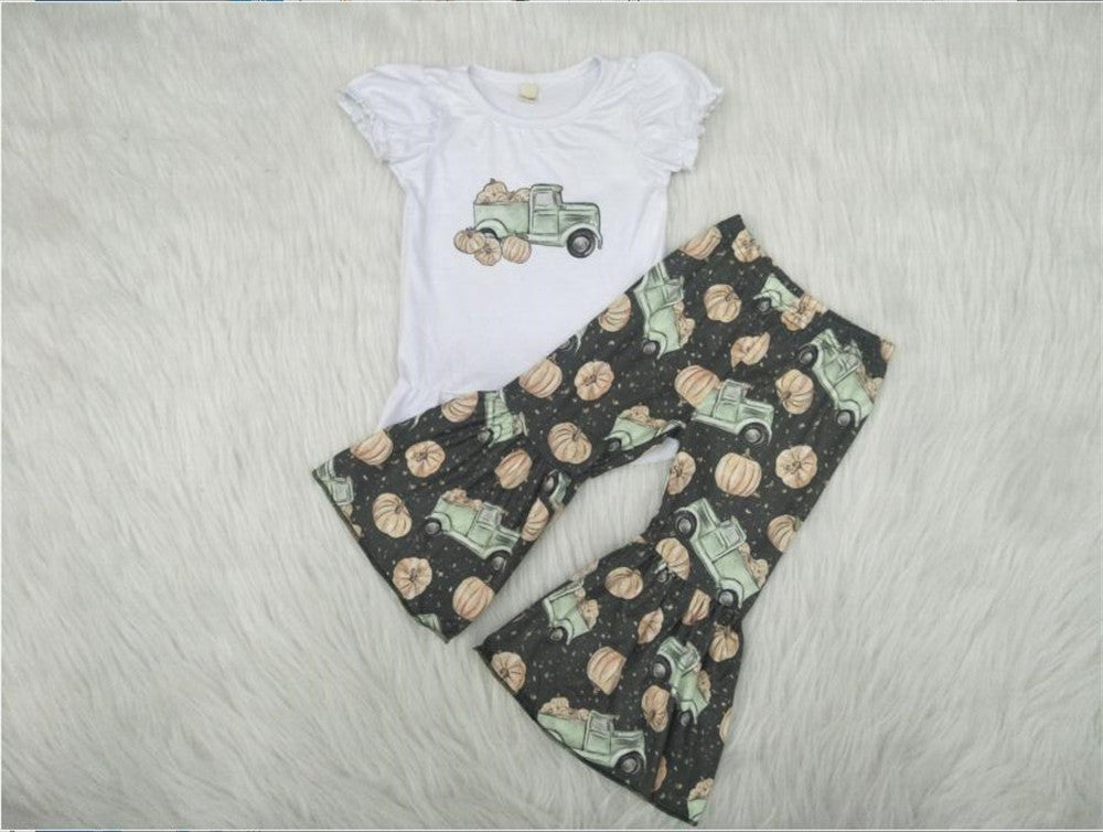 girl pumpkin truck top green bell pants set