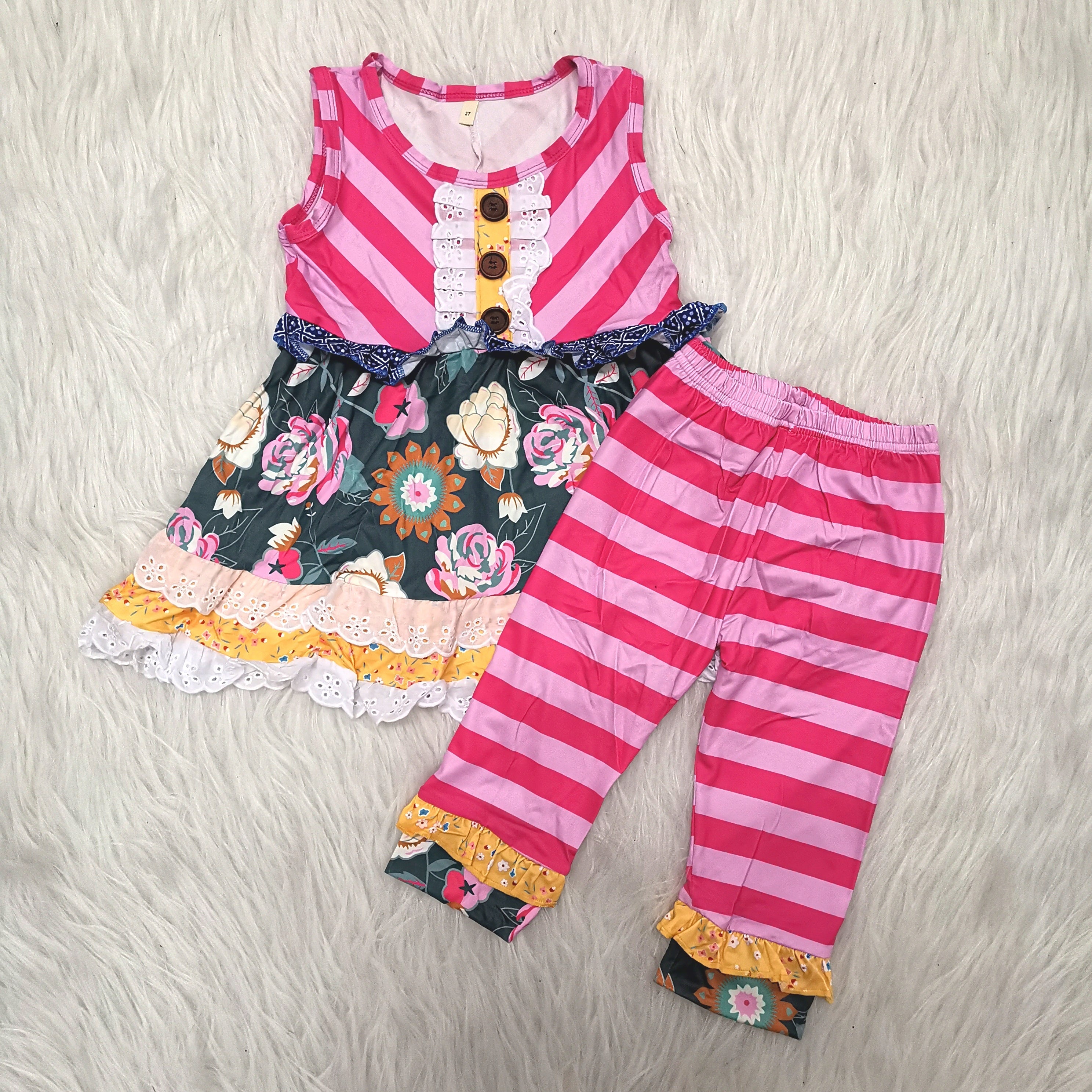 girl pink stripe flower capris sleeveless spring fall set