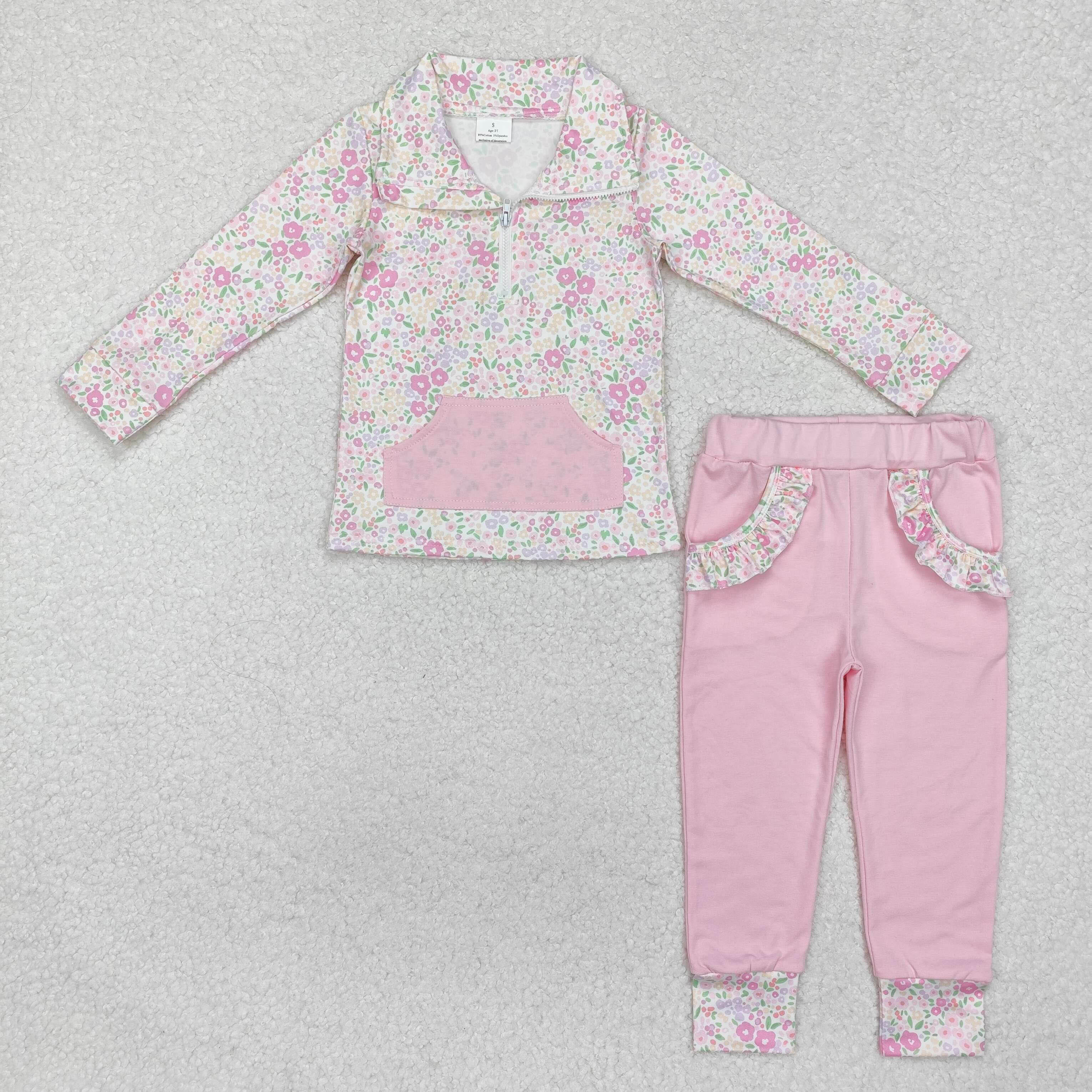 GLP2118 RTS toddler girl clothes floral girl winter set pink floral zipper outfit